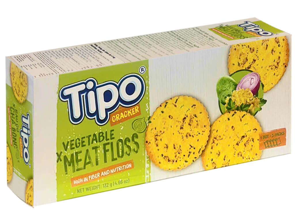 Thành phần: Bột mì, dầu cọ tinh luyện, đường, tinh bột khoai tây 8%, maltodextrin, xốt gia vị 1.23% (có chứa 37% rau củ (hành tây, hành tím, tỏi, hành lá, cà chua), vảy khoai tây 1.16%, muối, chất nhũ hóa), chất tạo xốp, chà bông gà 0.61% (thịt gà, đường, dầu cọ olein tinh luyện, bột gia vị gà, nước mắm, chất điều vị,…),…