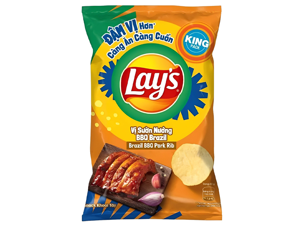 Thành phần: Khoai tây, dầu cọ, bột gia vị sườn nướng BBQ 5.2% (đường, maltodextrin, muối, chất điều vị (E621, E627, E631), chất điều chỉnh độ axit E330, chất chống đông vón (E551, E554), màu tự nhiên E160c, chất tạo ngọt E951, màu tổng hợp E110, hương liệu giống tự nhiên, nước tương)